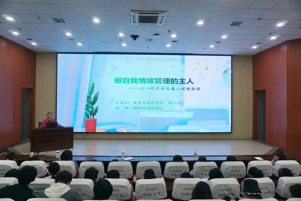 为扎实推进美术与设计学院心理健康教育宣传月活动,美术与设计学院开设了“心理健康教育专题课堂”。10月29日下午,在图书馆一楼报告厅,学院党委副书记徐小玉为全体2024级新生做了心理专题讲座。