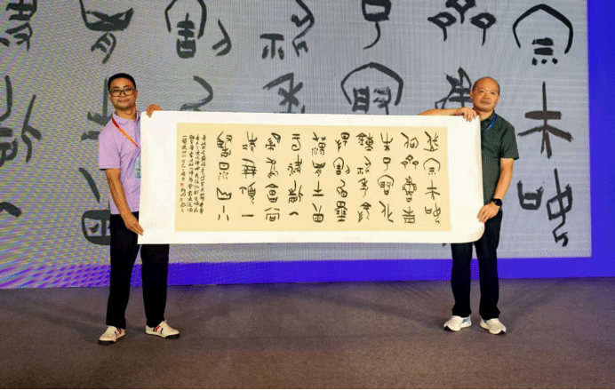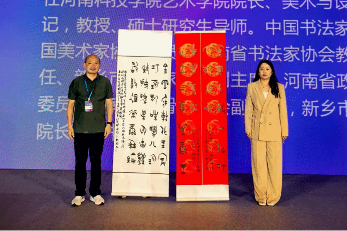 展会上,还举办了张新词书法作品捐赠仪式,将甲骨文书法作品《“宸开可立”联》”及“《望岳》(杜甫)”分别捐赠广东宸可集团和吉蛋堂农业有限公司,广东宸可集团董事长刘静、吉蛋堂农业有限公司CEO黄明哲接受了捐赠。