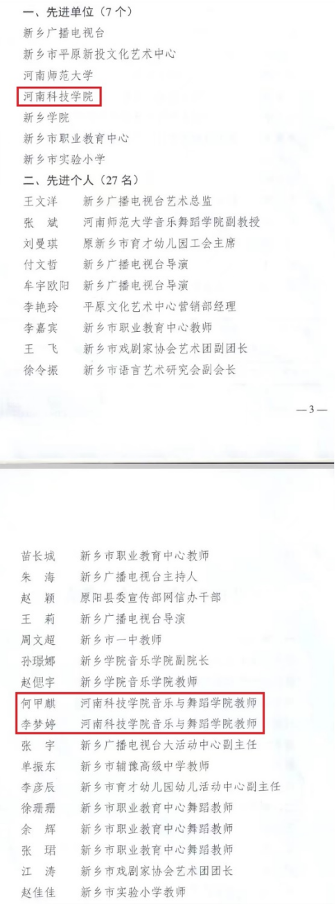 5月15日,新乡市人民政府发布政府工作通报,通报表扬在2023中国百泉药交会开幕式暨文艺晚会中主动作为、敢于担当、攻坚克难、奋勇争先的先进单位和先进个人。我校获组织工作先进单位,音乐与舞蹈学院教师何甲麒、李梦婷获先进个人。