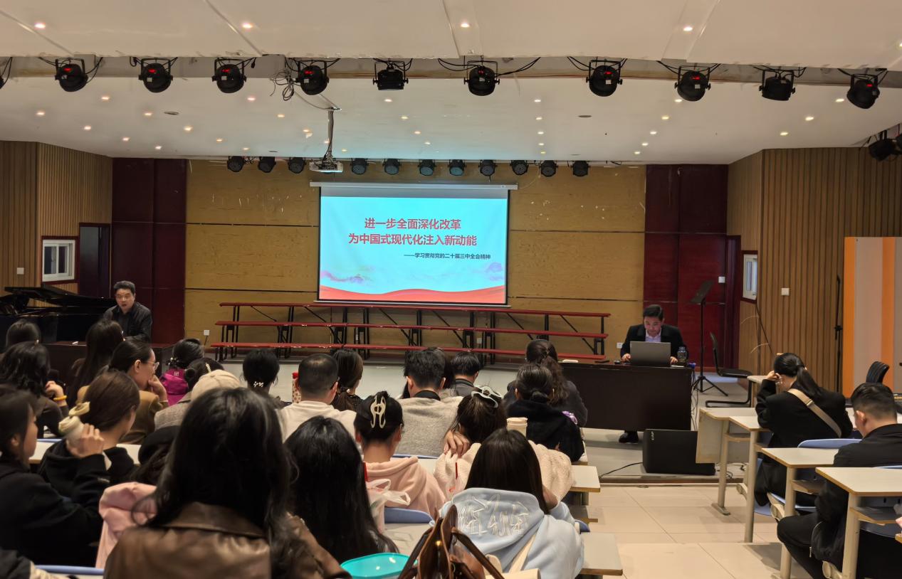为深入学习贯彻党的二十届三中全会精神,10月31日,音乐与舞蹈学院特邀校宣讲团成员、马克思主义学院党委副书记刘中元在11号楼音乐厅为学院全体教工、学生党员及学生干部宣讲党的二十届三中全会精神。