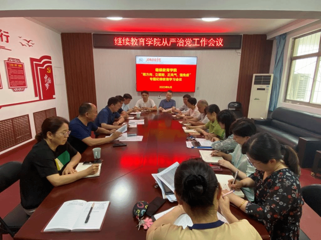 6月16日上午,继续教育学院在二楼会议室召开政治理论学习会议暨全面从严治党工作会议,学院党政班子成员和全体教职员工参加了会议。会议由学院党总支书记郭东升主持。